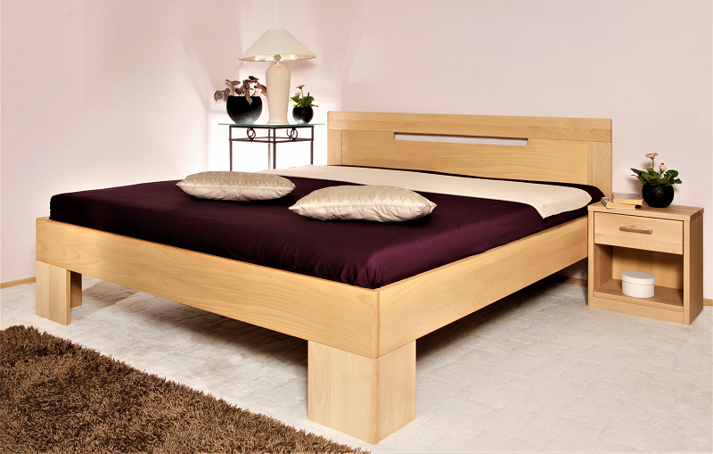 Luxusní masivní postel vyrobená z průběžného buku, který zajišťuje celistvý vzhled dřeva. K výjimečnosti této kvalitní postele přispívá zaoblení hran a její zvýšená lehací plocha ve výšce 50 cm s několika možnostmi nastavení výšky matrace od podlahy. Charakteristický moderní designový vzhled jí dodává obdélníkový otvor v čele postele.