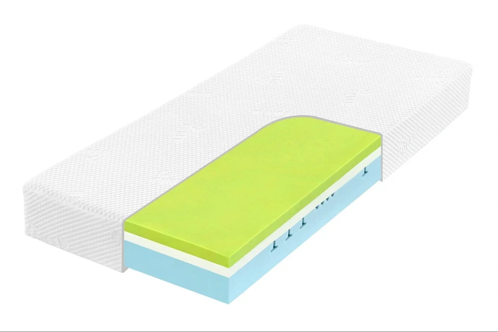 Vrchní vrstvu matrace představuje antibakteriální paměťová pěna CuremfoamTM Super Volume VISCO 85 kg/m3 velmi vysokého objemu. Tato unikátní pěna odlehčuje a zároveň podpírá, dopřeje Vám maximální pohodlí a ortopedické vlastnosti. Pouze tato pěna dokáže navodit doslova pocit beztíže. Díky tomu, že na tělo nevytváří téměř žádný tlak, uleví svalům a kloubům, nedochází k „přeležení“ a účinně bojuje proti proleženinám u dlouhodobě ležících osob.