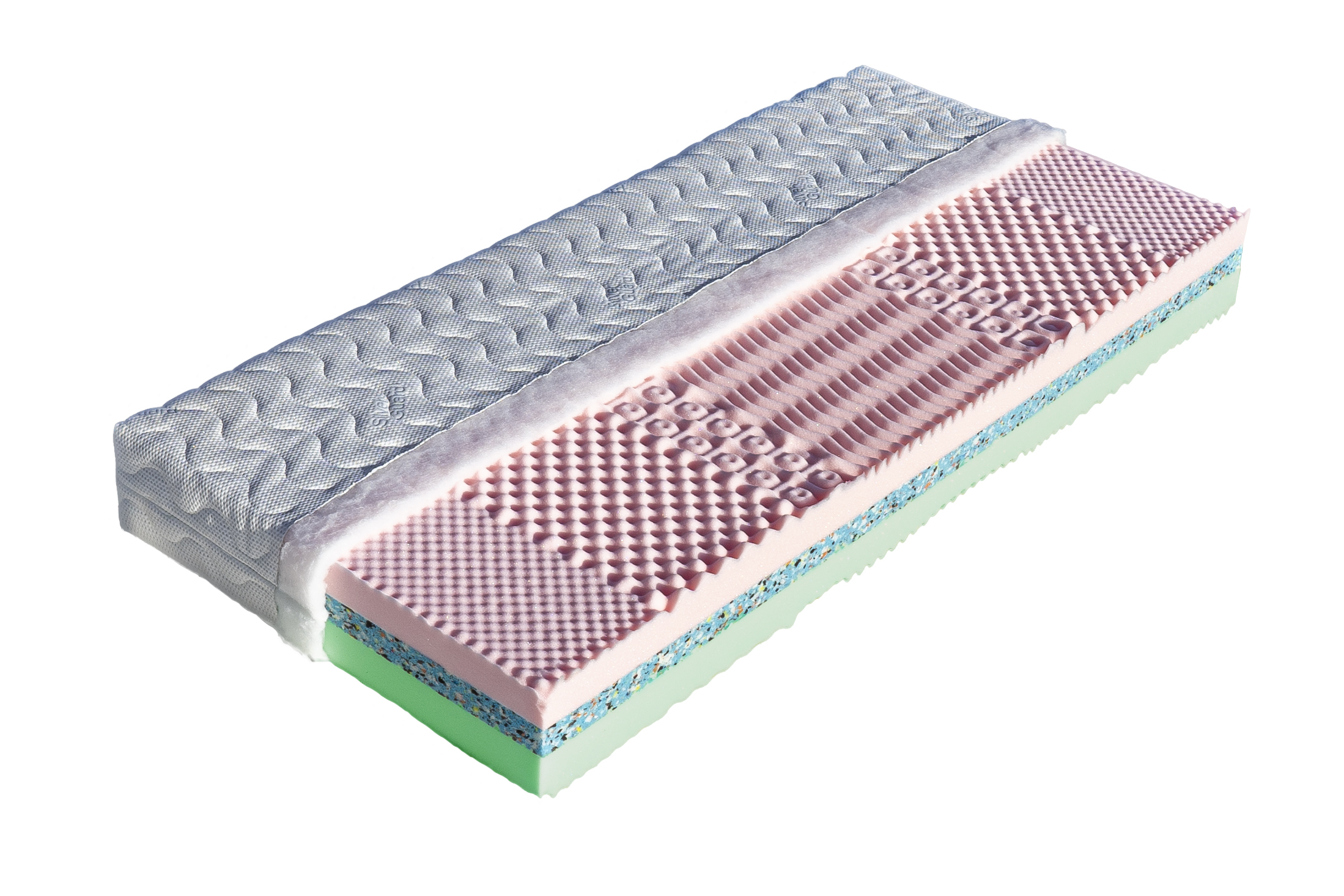 Proč se tato matrace řadí mezi nejprodávanější na trhu? Sedmizónová sendvičová matrace s volbou dvojí tuhosti. Střed jádra matrace je zpevněn pojeným polyuretanem (PUR RE 80). Nosné vrstvy jsou tvořeny kvalitními elastickými pěnami MediFoam (28 a 30 kg/m³), které jsou tvarovány do masážních nopů. Nopy zabezpečují prokrvení pokožky a uvolnění svalů během spánku. Matrace je vhodná na všechny typy roštů.