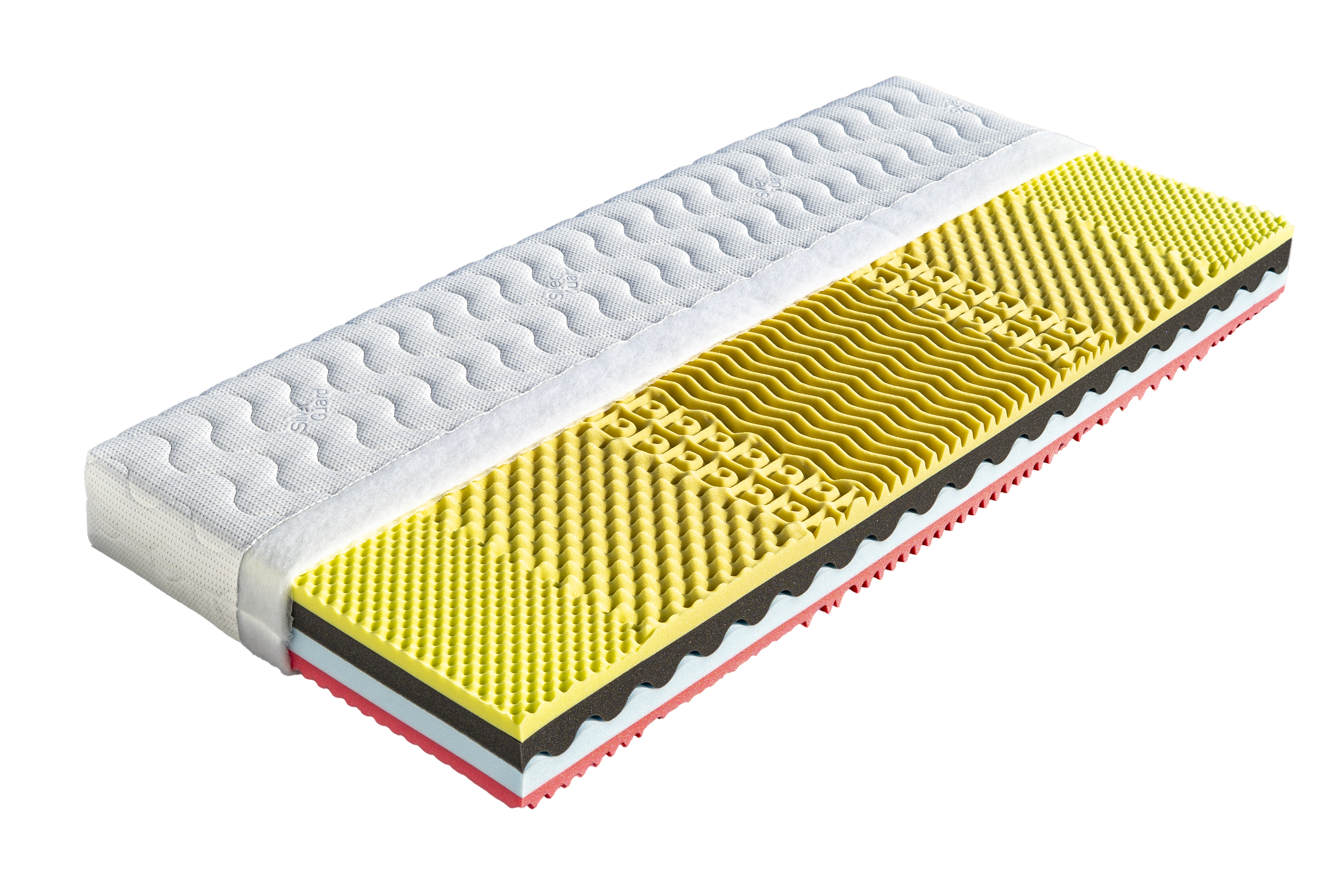Černá pěna (35 kg/m³) je příjemně elastická, modrá tvrdší (35 kg/m³) s vyšším odporem proti stlačení. Mezi pěnami je volná mezera, která zlepšuje provětrání matrace.