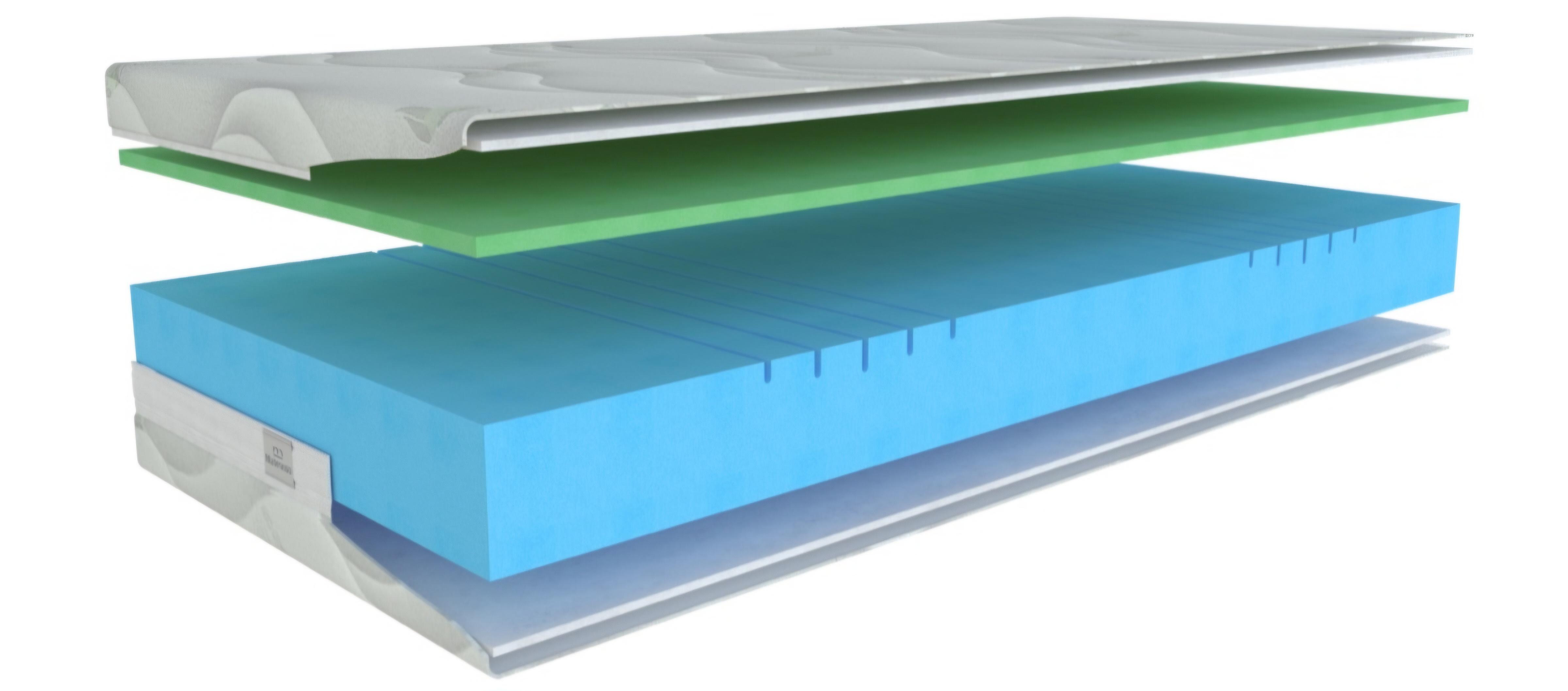 Spodní deska: značková pěna ELIOCELL - vyjímečná pěna, jejíž struktura je tvořena z miliónů mikropórů. Porézní struktura zaručuje vzdušnost, vyšší životnost a materiálovou stálost matrace o hustotě 35 kg/m3;