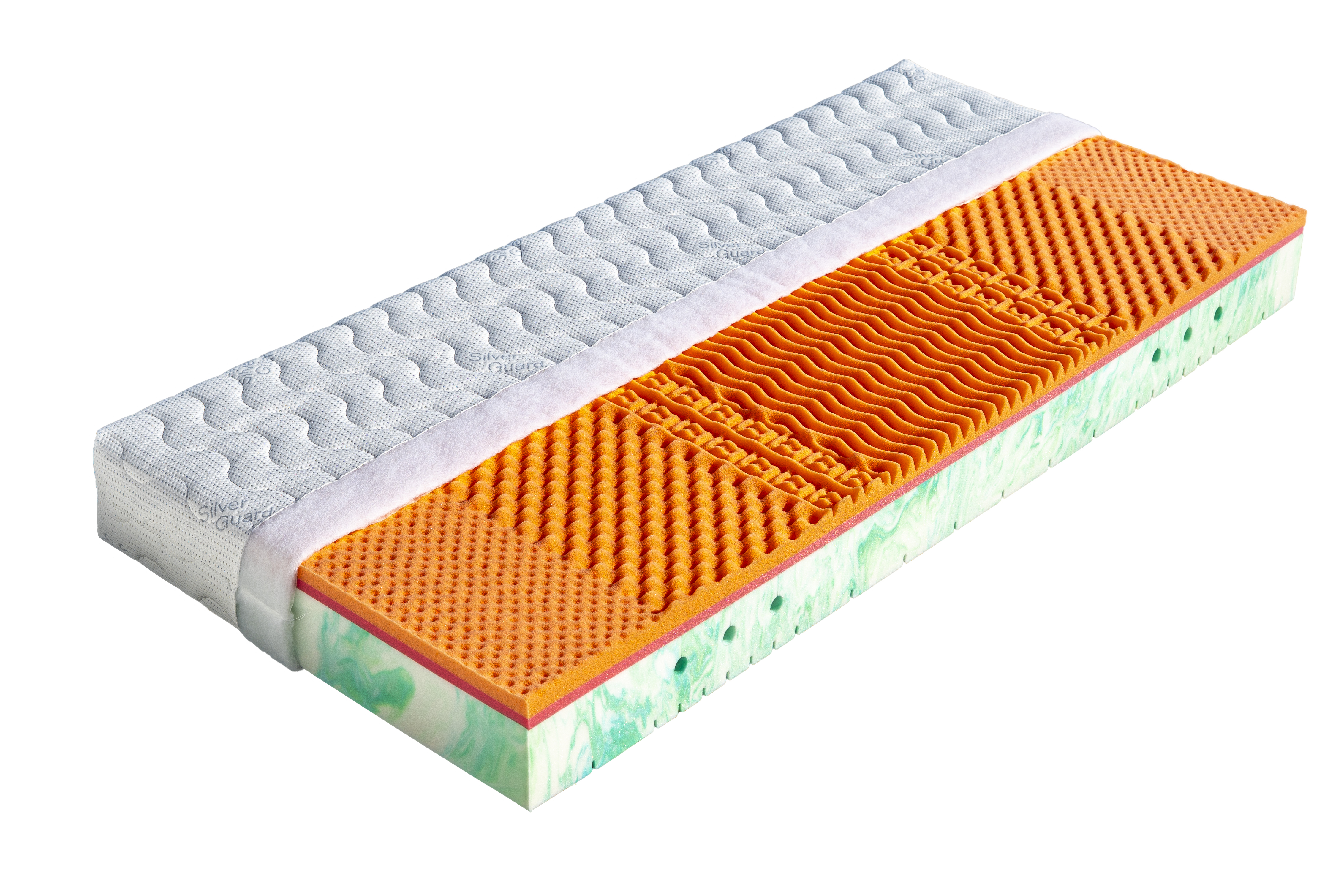 Sedmizónová matrace s hráškově žíhanou pěnou MediFoam (38 kg/m³), která má zónovité prořezy a tvrdost č. 3. Navíc její otvory v místech pod rameny vytvářejí tzv. ramenní kolébku – ideální pro spaní na boku.