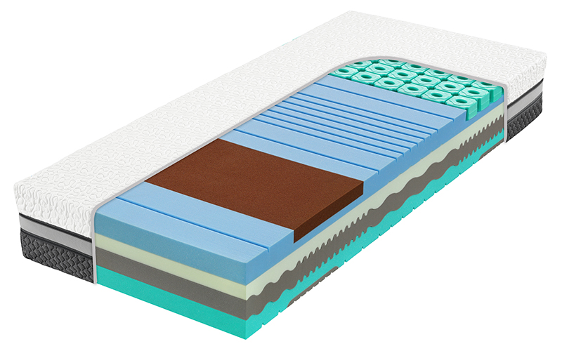Hybridní pěna 45 kg/m3 (8 cm) spojuje výhody studené pěny (vzdušnost, pružnost), latexu (termoregulace, nezničitelnost) a visco pěny (přizpůsobivost).