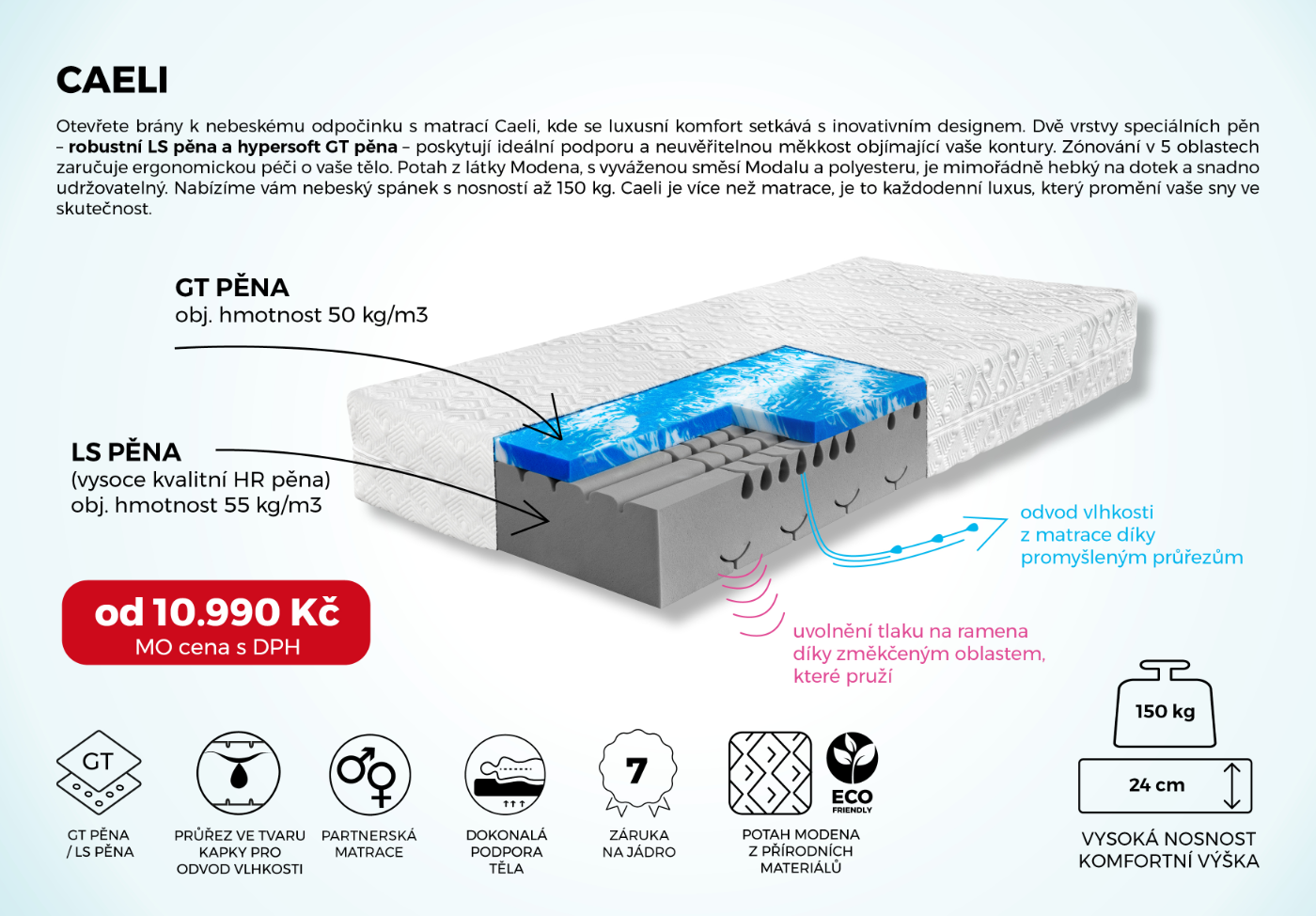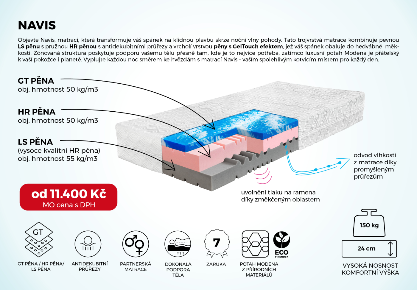 Matrace Navis a Caeli jsou vytvořeny s důrazem na maximální komfort a zdravý spánek. Díky pokročilým technologiím a špičkovým materiálům posouvají komfort na zcela novou úroveň. Speciální pěny poskytují nejen optimální oporu, ale i dlouhodobou odolnost. Inteligentně navržené průřezy umožňují matraci dynamicky reagovat na každý pohyb těla, čímž zaručují dokonalou ergonomii a individuální přizpůsobení. Další výhodou je antistatický potah, který přispívá k čistšímu a zdravějšímu prostředí na lůžku.