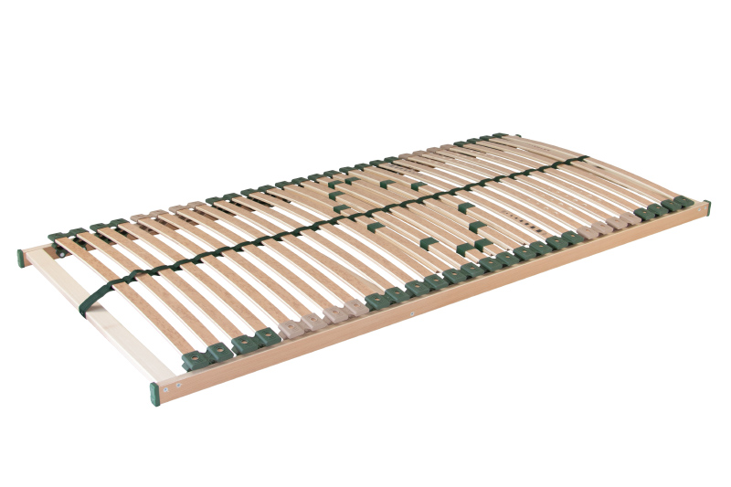 Pohodlný a odolný rošt s pouzdry uloženými nad bočnicí poskytuje vyšší komfort při spánku. Speciálně uložená výkyvná pouzdra zaručují vyšší nosnost a odolnost proti prudkému zatížení. Pružné lamely v 7 anatomických zónách se natáčejí a reagují na pohyb těla při spánku. Každá část těla je tak individuálně podepřena. Změkčení v ramenní oblasti je správnou oporou páteře při spánku na boku. Středový popruh zlepšuje stabilitu roštu. Posuvnými objímkami lze nastavit individuální tuhost v bederní části. Lamely opatřené folií zabraňují pronikání vlhkosti do roštu a usnadní údržbu roštu.
