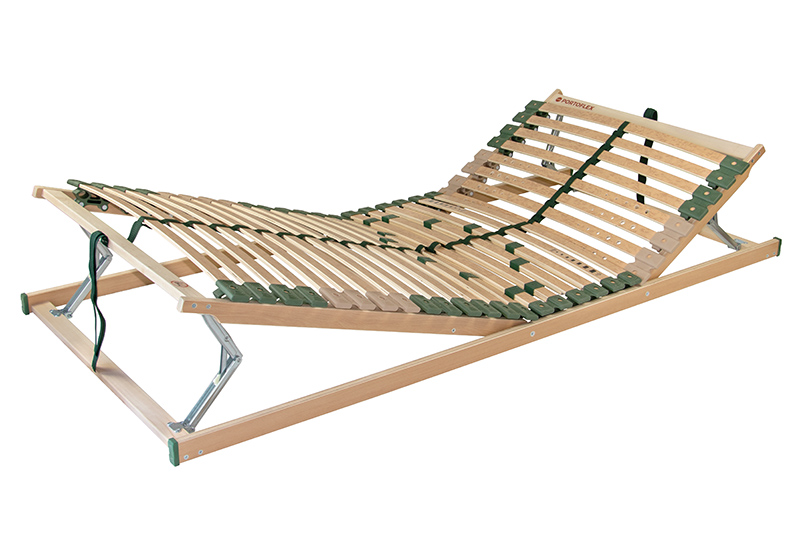 Pohodlný a odolný rošt s pouzdry uloženými nad bočnicí poskytuje vyšší komfort při spánku. Polohování hlavy i nohou oceníte při čtení a odpočinku. Pevná středová část se postará o lepší oporu beder. Speciálně uložená výkyvná pouzdra zaručují vyšší nosnost a odolnost proti prudkému zatížení. Pružné lamely v 7 anatomických zónách se natáčejí a reagují na pohyb těla při spánku. Každá část těla je tak individuálně podepřena. Změkčení v ramenní oblasti je správnou oporou páteře při spánku na boku. Středový popruh zlepšuje stabilitu roštu. Posuvnými objímkami lze nastavit individuální tuhost v bederní části. Lamely opatřené folií zabraňují pronikání vlhkosti do roštu a usnadní údržbu roštu.