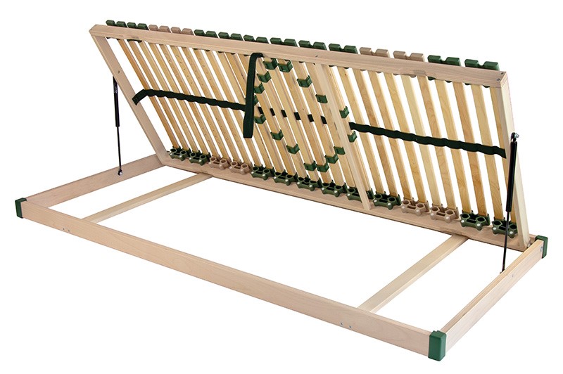 Díky zpevněné konstrukci a silnějším lamelám je tento rošt přizpůsoben pro vyšší zátěž, až 150 kg. Postelový rošt s bočním výklopem pro přístup do úložného prostoru řeší nedostatek místa v ložnici. Zdvih pomocí textilního úchytu usnadní každodenní manipulaci. Speciálně uložená výkyvná pouzdra zaručují vyšší nosnost a odolnost proti prudkému zatížení. Rozdělení roštu do 7 anatomických zón umožní optimální oporu v oblasti hlavy, ramen, trupu, beder, stehen, lýtek a chodidel. Frézované lamely v ramenní oblasti poskytnou správnou oporu páteře při poloze spánku na boku. Středový popruh zlepšuje stabilitu a vyrovnává zatížení roštu.